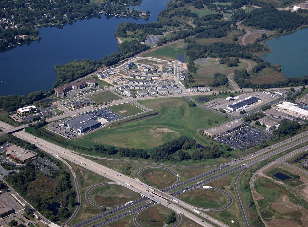 The New Brighton Exchange project in New Brighton, MN. Barr Engineering worked with the city to clean up and develop the area, which had included two former dumps, two Superfund sites, and several petroleum-release sites. Most of the area is now redeveloped and includes office buildings, apartments, and parks.