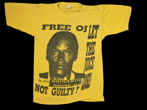 OJ is not around to appreciate the by proxy support offered by Martin’s show. He is in prison for thirty years for the armed re-robbery of what he claimed was sports memorabilia stolen from him, an insane thing for a man so closely scrutinized by society to do. It was a dumb, unsympathetic crime, and it seems that most people feel the same way. His recent incarceration was only a minor scandal, eliciting not protest from the public but rolled eyes and annoyed sighs. There is nothing especially political or controversial about his new charges, just the logical result of some rich prick blowing his third chance at life. Indeed: a search for current OJ-related shirts yields designs where he is only the butt of jokes. (“I Told You OJ Did It – Again;” What Happens in Las Vegas Stays in Las Vegas” (where the recent robbery occurred).) The impact of the original trial and its verdict may have lessened over time, but that moment in time when OJ stood for much more than even he could imagine is carried on through these shirts, as are the raucous spirits of DIY designers, trials by media, and artless art. Thank you Martin Hugo for maintaining this collection and preserving for us an outrageous chapter of human history.