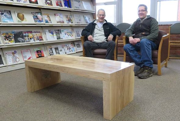 Local woodworker Tom Hawley and local arborist Bob Moore recently sat in front of the new table Hawley made for the Yellow Springs library’s periodical room. The table was made with local wood harvested by Moore from ash trees, which were felled by the Emerald Ash Borer. (Submitted photo)